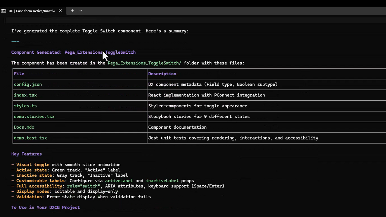 Watch the skill in action: from installing to generating a custom toggle component in under a minute.