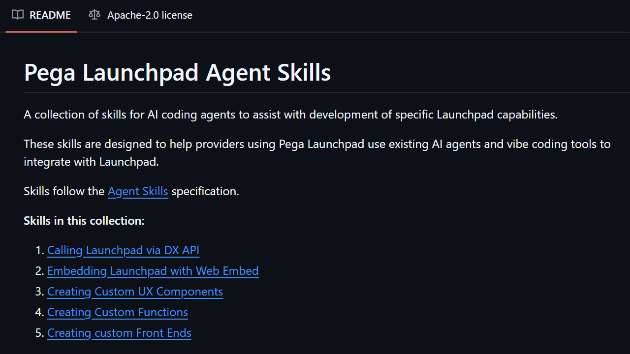 Explore the repo: https://github.com/pegasystems/pega-launchpad-agent-skills